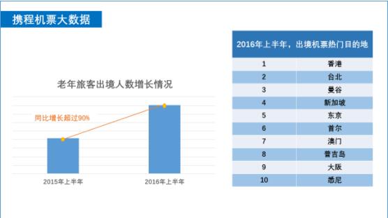 报告还显示,2016年上半年,通过携程预订出境机票的老年旅客数量同比去年增长超过90%。不过,老年游客还是青睐于选择飞行时长较短的周边国家或地区作为出境目的地。