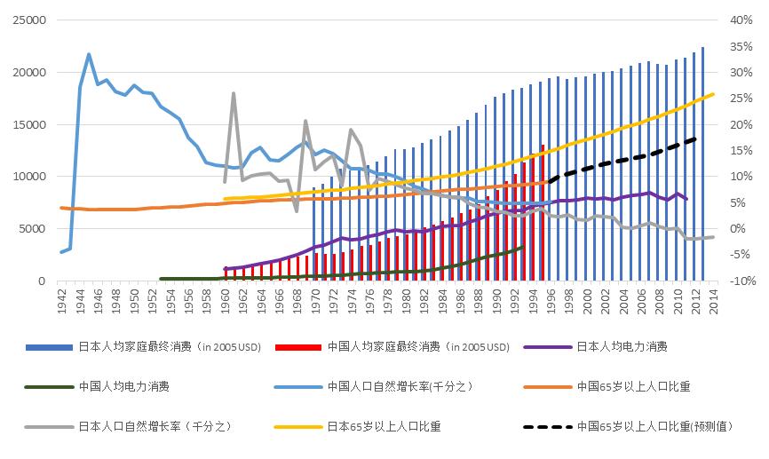 中日数据的变化趋势出现很强的关联性,特别是自然人口增长率,基本在错配之后出现了重合。而作为重要经济数据的人均家庭消费和人均电力消费也出现了比较强的趋势性吻合。这也让我们看到了研究日本消费升级历史对中国消费升级投资的可能性。