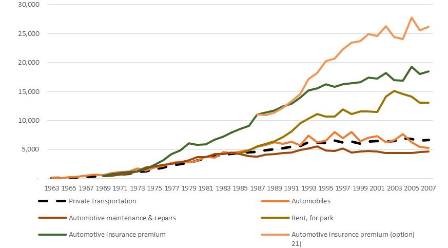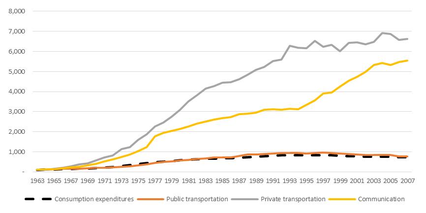 在过去的接近50年里面,公共交通在家庭可支配收入里面基本是没有变化的,维持在了人均消费的增长幅度。而30倍的增长主要来自于两个强大的增长动力:私家车和通讯费用。其实这两个增长的驱动力是不同的,前者平缓增长,像是一个Log曲线;后者则有两次明显的变化,一次在1975年左右,一次在1995年前后。