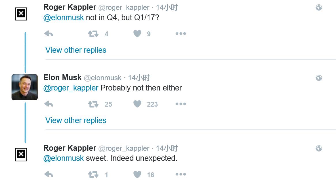 马斯克昨天在自己的Twitter上宣布,特斯拉将不需要在第四季度通过发行股票或债券来收购SolarCity,而网友Roger Kappler在Twitter上追问马斯克是否将在2017年第一季度进行融资时,马斯克又表示那时候可能也不会。