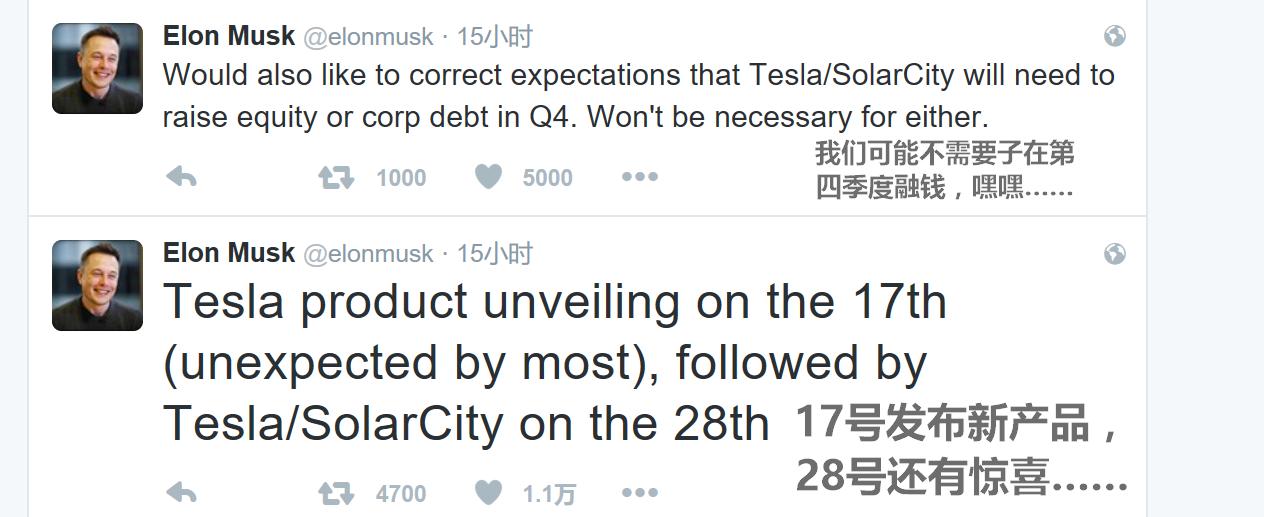 一个是他宣布本月17日将发布一件大家都意想不到的新产品;第二个则是宣布特斯拉将不必为收购SolarCity在今年第4季度展开股权或债务融资。