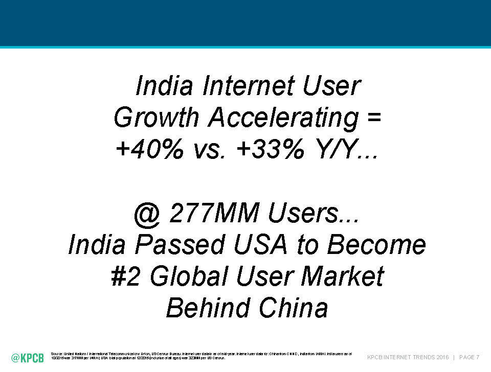 在这些独角兽中,Ola是出行领域的代表。“互联网女皇”玛丽·米克尔(Mary Meeker)在《2016互联网趋势报告》中指出,以打车订单量来看,2014年第一季度印度通过移动应用打车的人还很少。然而到2016年第一季度,印度已成为排名中国和北美之后的第三大打车应用市场。