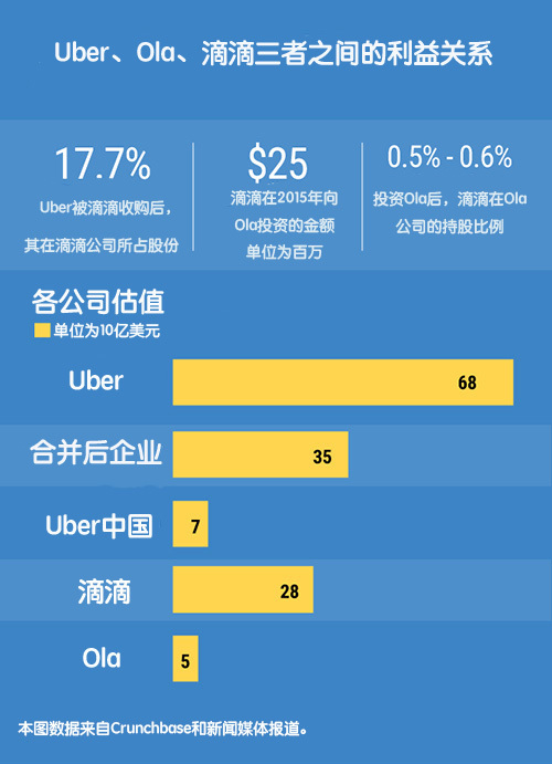 此前,就有多家媒体分析Uber和Ola的合并概率有多大。Uber拥有滴滴17.7%的股份,滴滴拥有Ola5%-6%股份,这就让Uber间接拥有了Ola的股份。