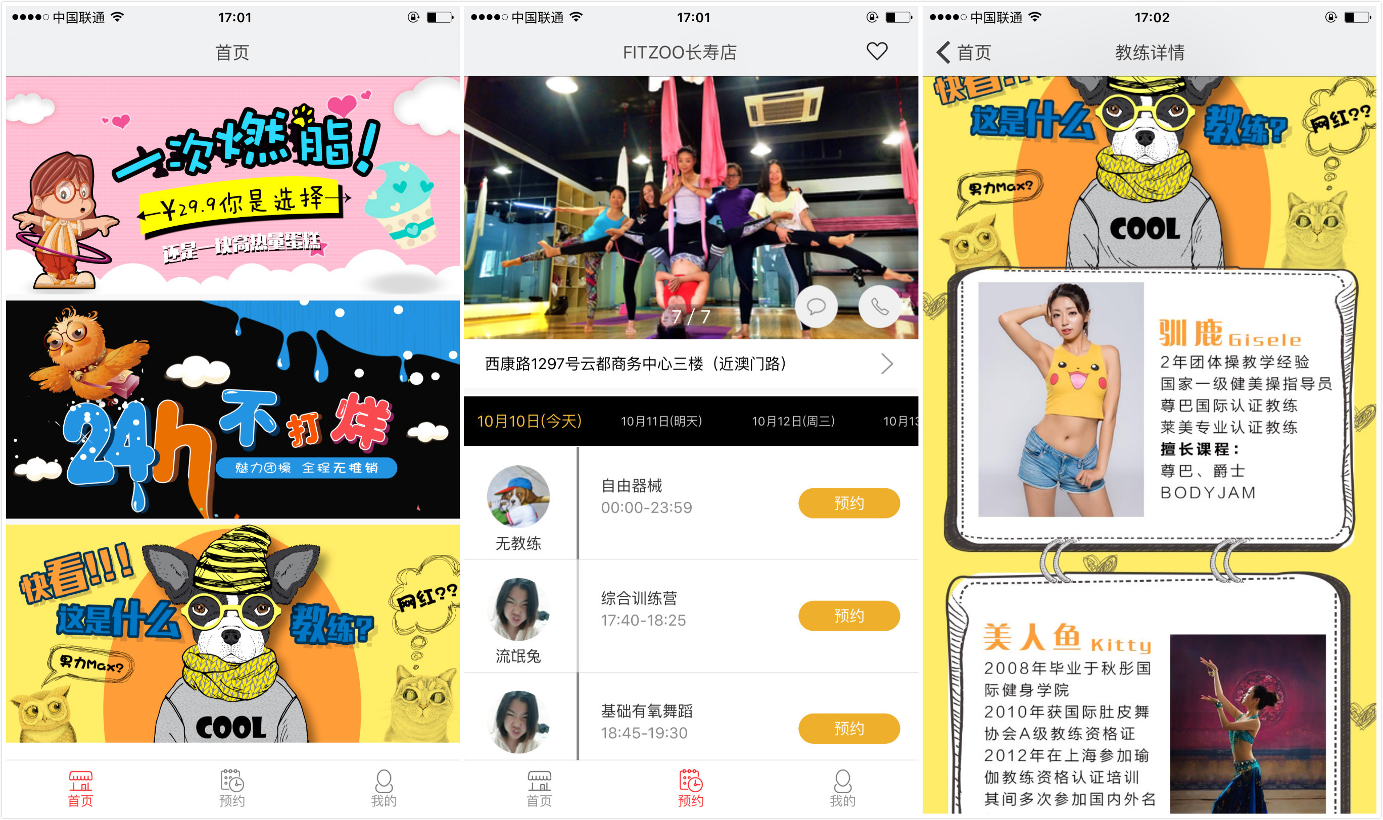 Fitzoo App也已经上线,用户可以通过 App 预约课程、选择教练。自助进入的烦事主要通过线上生成的二维码扫描进入。自营的店会有一到2人的专人24小时负责。