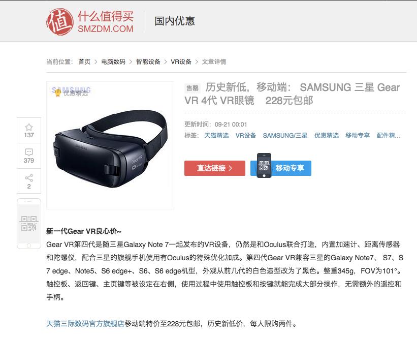 图1:9月21日淘宝惊现229元Gear VR,图片来自什么值得买