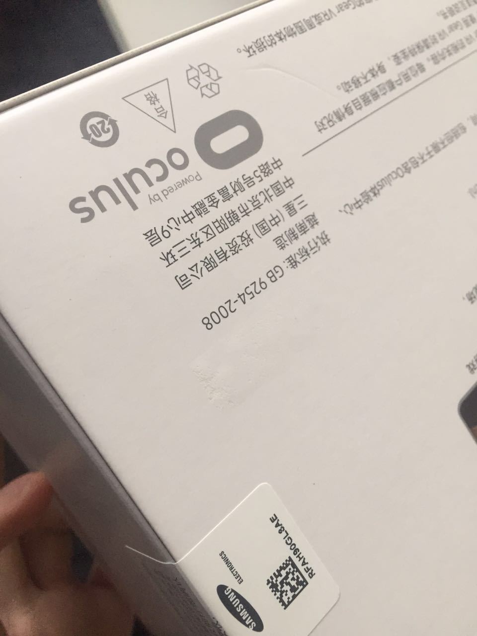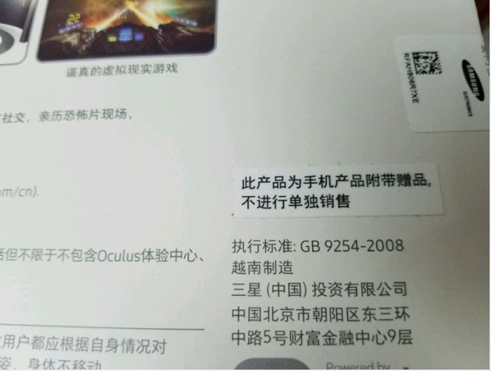 根据36氪自己购买、查看销售记录、采访购买者及业内人士获得的消息,这一批国行版Gear VR的外包装上贴有“此产品为手机产品附带赠品,不进行单独销售”的标签,不过有不少在实际销售中已经被撕掉,但在背面“执行标准:GB 9254-2008”一行字的上面,还能隐约看到标签被撕掉的痕迹。