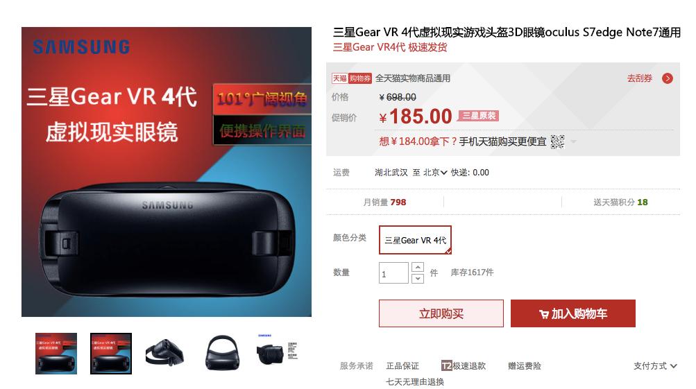 图7:售价174元的Gear VR价格已经上调至185元,图片来自淘宝