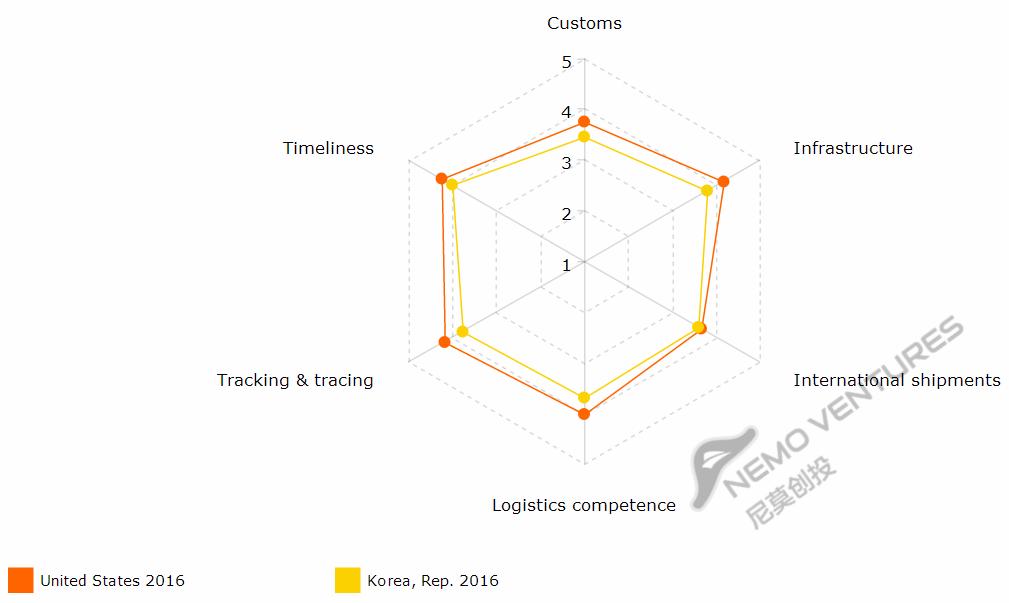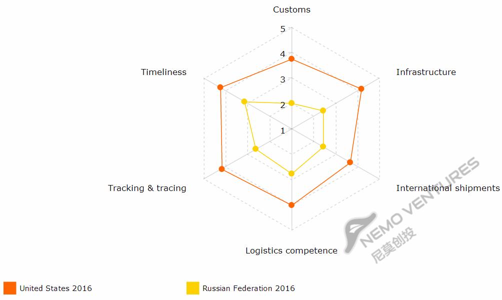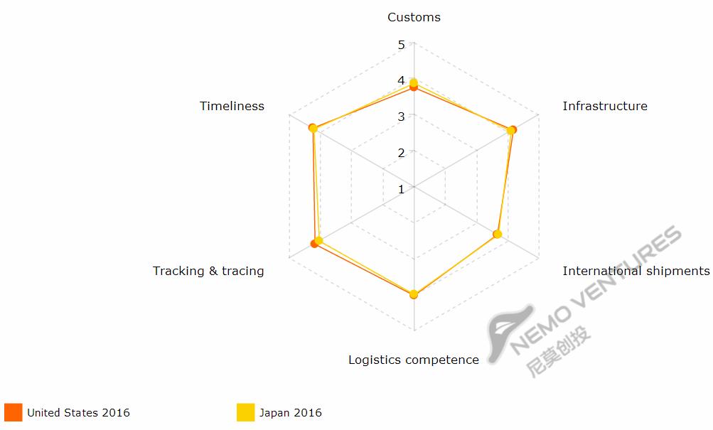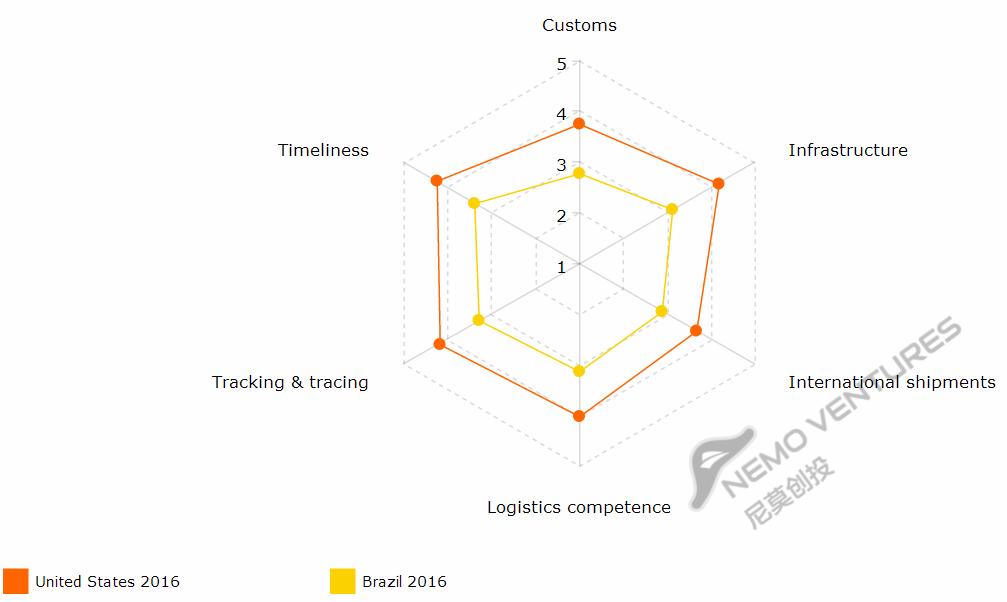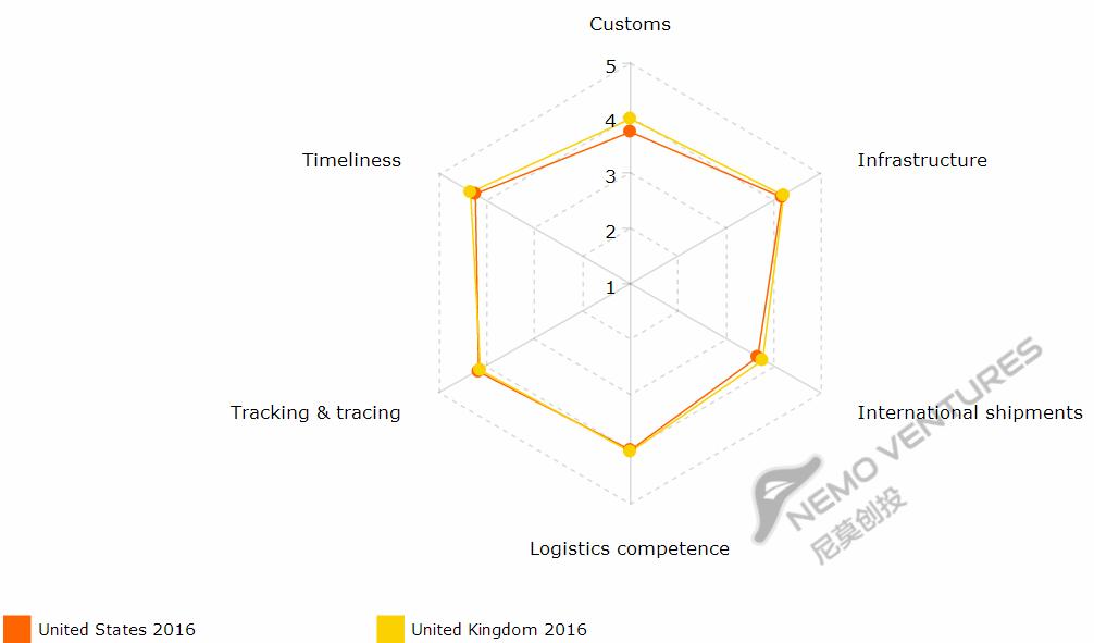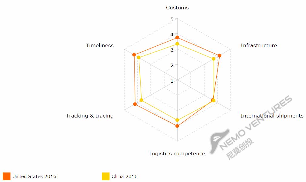 下面图表以美国为基准,比较各国物流六个指标