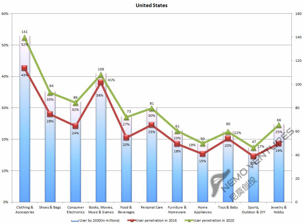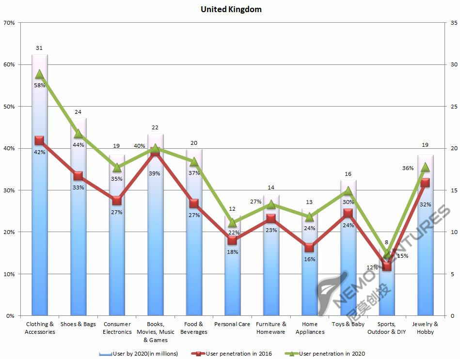 各品类的渗透率英国美国看上去比较相似。2016年英国电商渗透率为81%,全球排名第一,随后分别为日本(74%)、德国(73%)、美国(65%)。预计2020年英国电商渗透率为90%,德国日本均为81%,美国为70%。