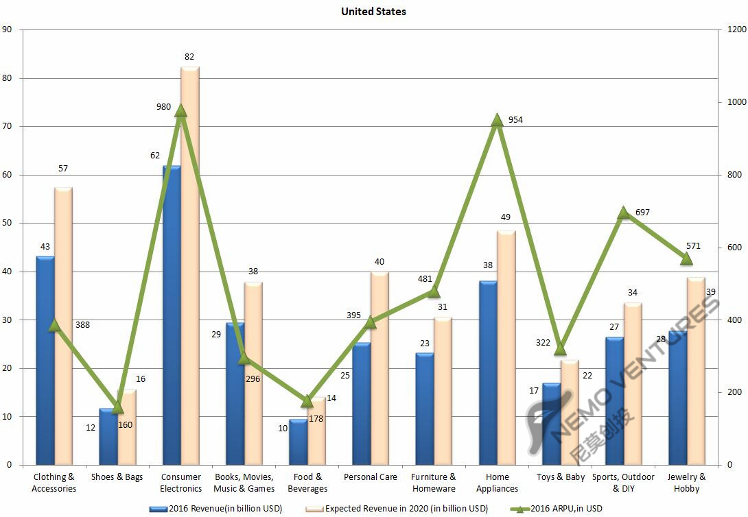 要小心,虽然美国目前最大品类消费电子产品,消费频率和客单价都不错,市场规模和ARPU都最高,但这个方向市场很成熟,加之大量产品来自中国而中国供应商倾向打简单粗暴的价格战,预计未来几年消费电子方向的ARPU会下滑。其他品类ARPU都是上行。
