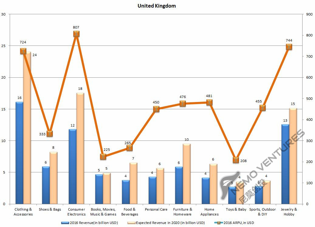 英国并不输于美国市场,虽然市场总量小一些,但ARPU并不低,甚至一些品类ARPU高于美国。如本文第一张图所示,2016年预计美国电商ARPU为1842美元,英国为1743美元,全球前两名。脱欧会短期内影响英国经济表现,但无碍于英国的强国本质。