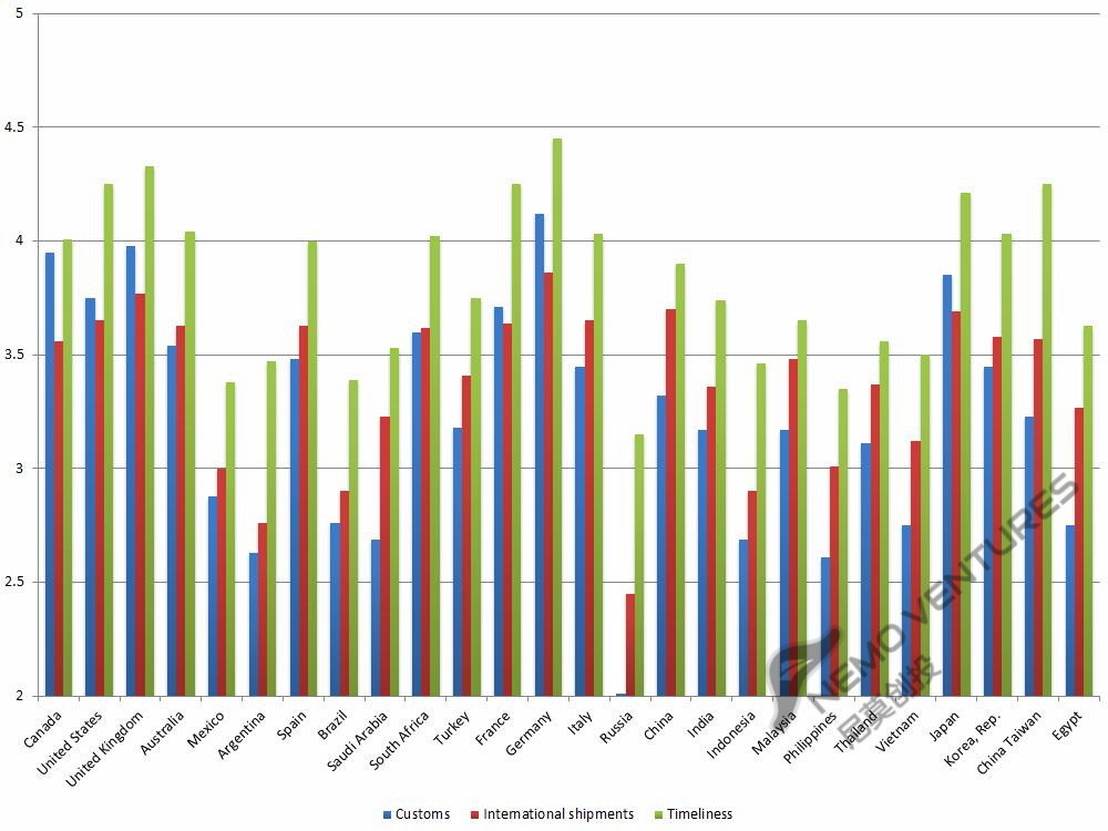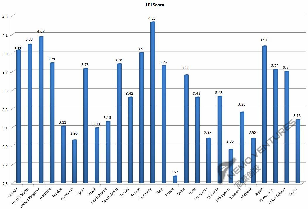 图中颜色越深说明物流越发达,反之则差。可见,物流最好的还是四大天王美英澳加、日韩、西欧和北欧、中国、南非。从物流角度看,印度、印尼、马来西亚、泰国、土耳其、沙特、埃及、巴西、墨西哥属于“次级”市场。