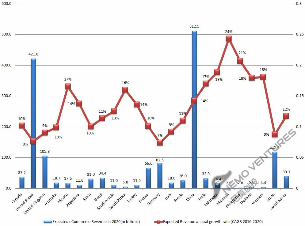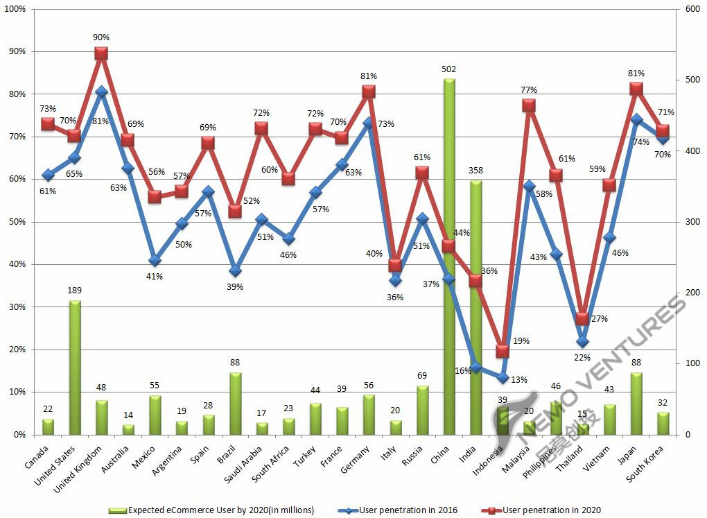 预计2020年的时候电商渗透率最高的几个国家依次为英国、德国、日本、马来、加拿大、沙特、土耳其、美国、法国。最低的是印尼、泰国、印度、意大利。
