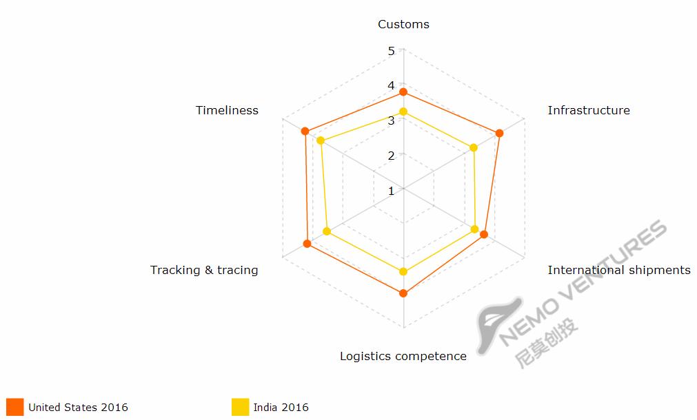 印度是人口大国,在国际货运总量上有一定优势,比较接近美国,但在其他方面相差甚远。突出的是基础设施差,物流和互联网都是。