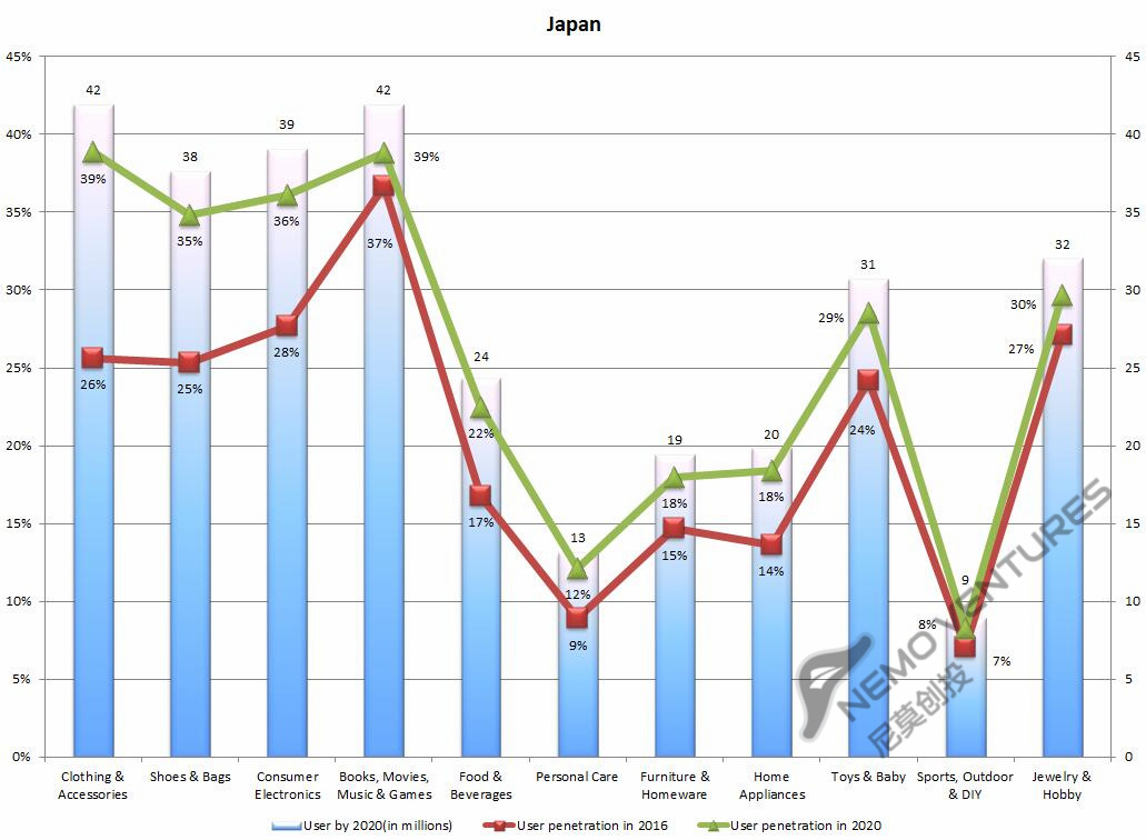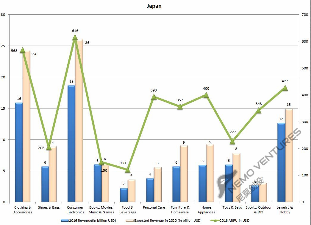 日本市场头部品类很明显,2016年服装服饰、消费电子、珠宝轻奢合计占电商市场55.3%。美国为36%,英国为54.7%;这三个品类的ARPU也相对高。增幅大的品类为服装服饰、消费电子,预计到2020年分别增加80、70亿美元,并且预计消费电子的ARPU会较明显增长;几乎没增长的预计为书籍内容、体育和户外用品。