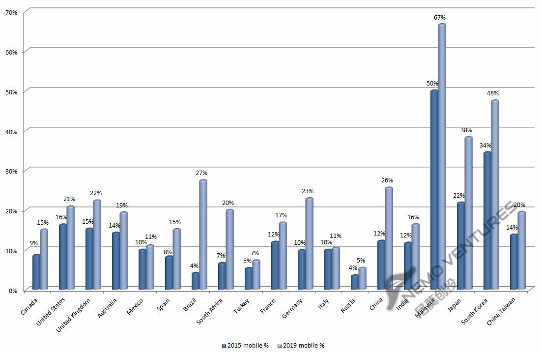 上图显示了各个市场的移动电商市场规模占电商整体规模的比例变化预期趋势。