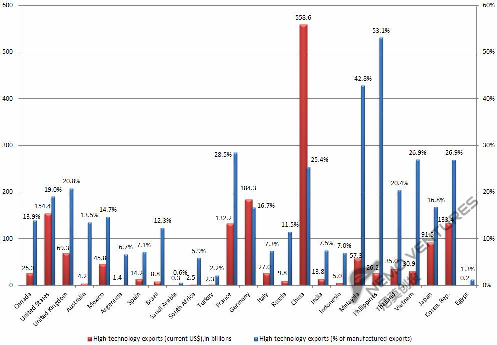 下图显示各国高技术产品出口情况