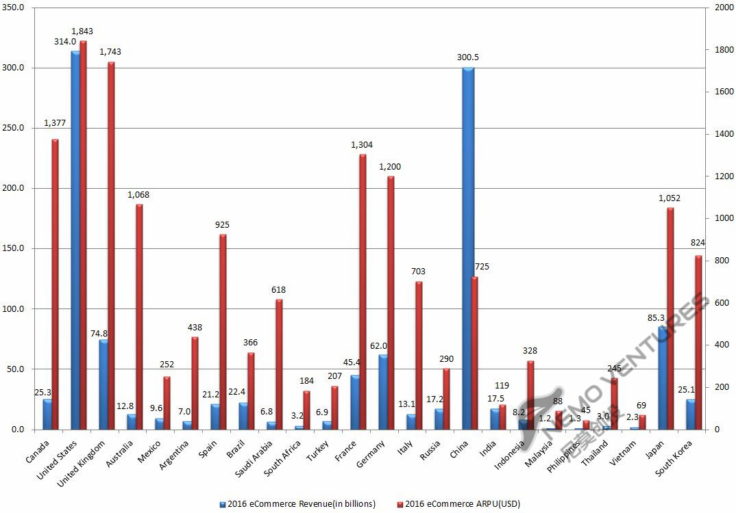 预计电商渗透率提高幅度大的国家有:加拿大(12%),墨西哥(15%),巴西(14%),沙特(21%),南非(14%),土耳其(15%),印度(20%),马来(19%),菲律宾(18%),越南(12%)。但要留意,预计印度的ARPU在未来几年中会持续下降,原因是大量“次级”用户涌入的摊薄作用。