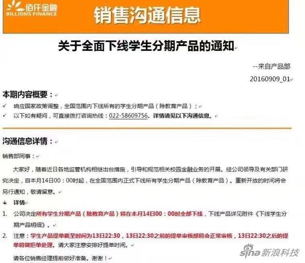 9月9日,一张疑似《佰仟金融关于全面下线学生分期产品的通知》截图流出,称自9月14日起佰仟金融将正式下线除教育产品外的所有学生分期产品,重新开放的时间另行通知。对此,佰仟金融对新浪科技回应道,“我们没有校园分期,我们是消费金融服务公司。