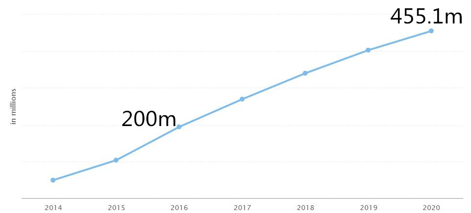 预计2016年移动支付用户数为2亿,到2020年增加到4.55亿,应该是中国和其他发达国家用户为主。