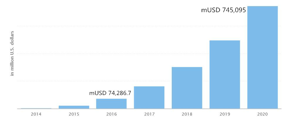 预计2016年全球移动支付额为743亿美元,到2020年预计增加十倍