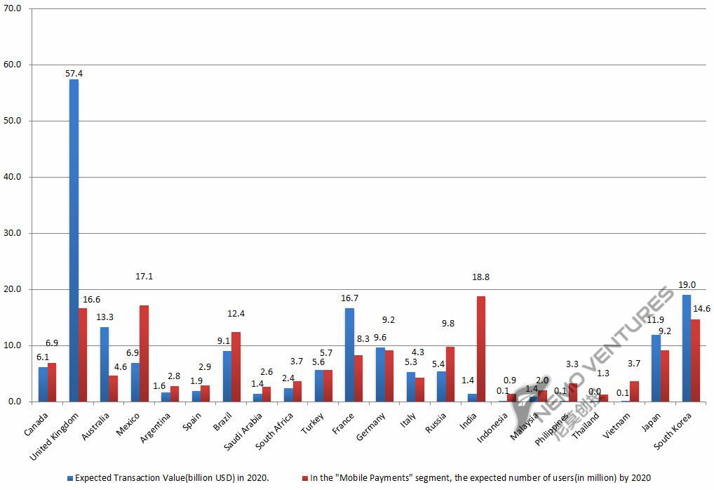2020年预期的交易额、2020年预期每用户平均移动支付金额,这2个指标各取前12名,然后取交集:美英澳加、巴西、土耳其、法德、中国、日韩。现在耕耘这些市场,几年后还是有些盼头的。