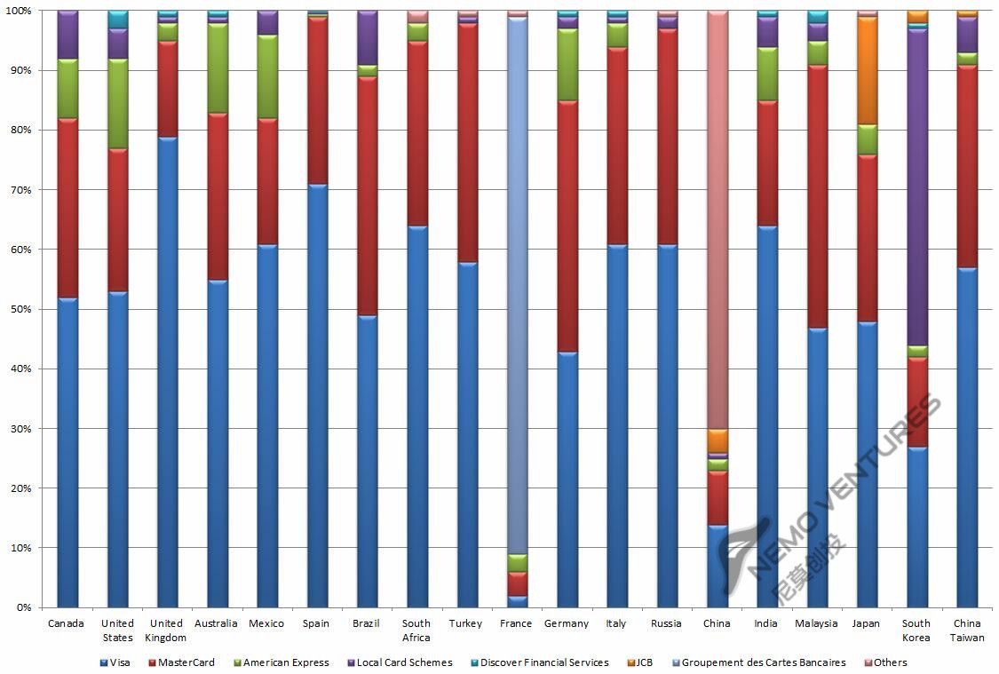 在中国电商支付环节,UnionPay 、Visa、MasterCard 各占70%、14%、9%的银行卡份额。