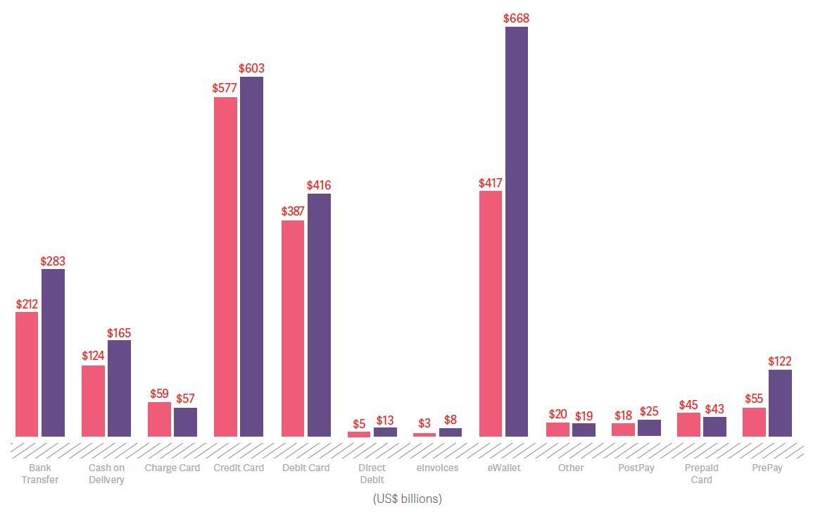 上图显示了2015年和2019年各种支付方式的市场规模(单位:十亿美元)。支付宝这种电子钱包增幅最大,且会成长为最主要的支付方式。信用卡和借记卡都会少量增长,但相对市场份额会被电子钱包挤压。银行转账和货到付款也会有些增长,但都不是全球普适型支付方式。PrePay增长很快,但绝对规模比较小,亦非普适型支付方式。