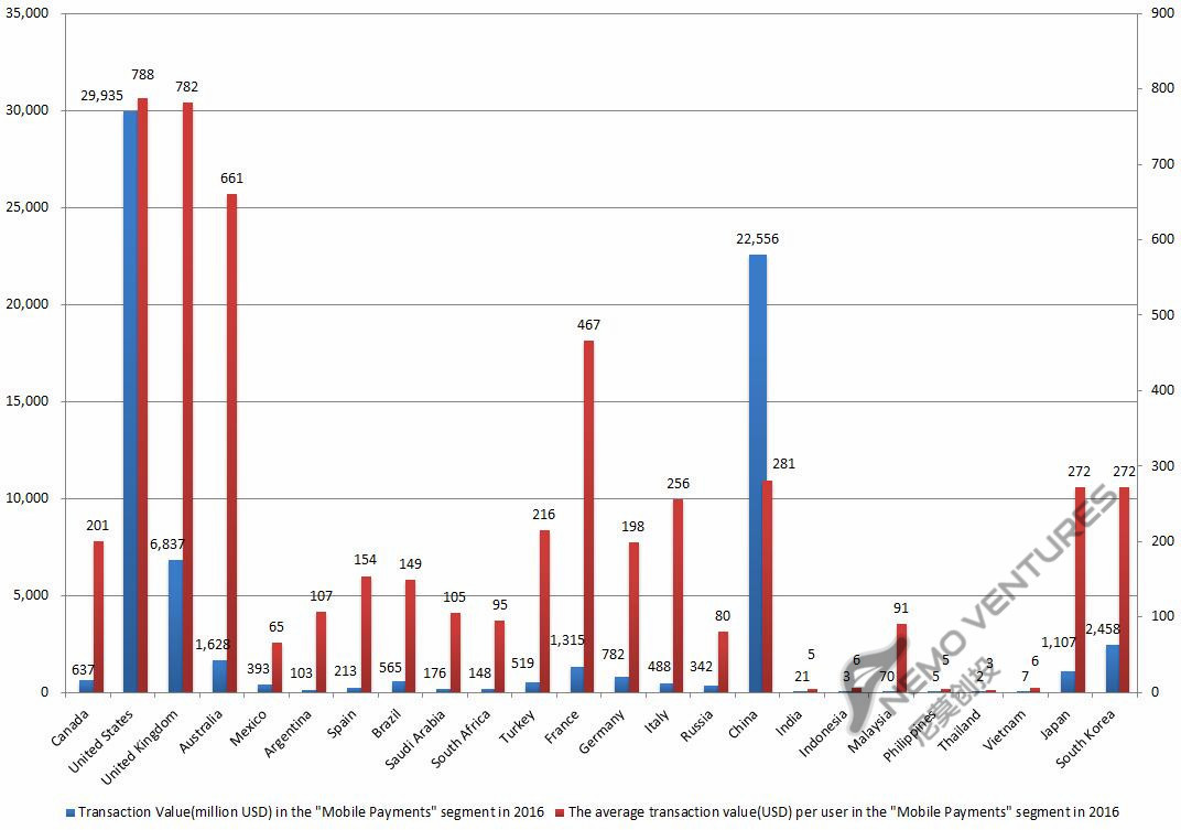 上图显示了2016年各国移动支付交易额(单位:百万美元)和人均交易额