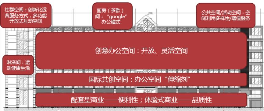 与众多办公空间不太一样的是,MORE的特点在于办公空间的品质提升和国际化。而商业地产的运营,除了众创空间以外,还包括商业项目和大型的办公空间,其中大型的办公空间包括500强的企业,商业项目包括创意类公司的体验点和配套商业,而众创空间则可引进更多的国际创业者入驻。三者之前相互配合,目标是打造一体化的创业平台。