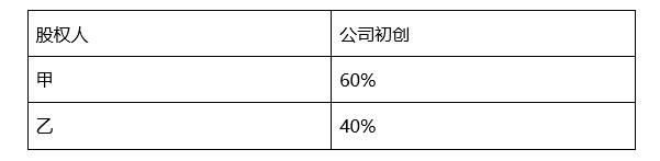例如:甲乙二人建立了企业A,他们两人的出资比例为6:4,则此时公司的股权结构为: