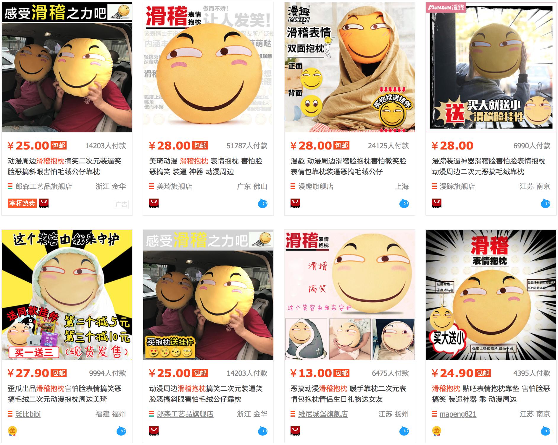近段时间,一款名为“滑稽抱枕”的周边成为了淘宝动漫类目的爆款。在淘宝搜索“滑稽抱枕”或者“滑稽脸”关键词,不难发现这个售价20多元的抱枕周边,绝大部份淘宝卖家都达到数百数千个的销量,甚至有的卖家可以达到近30天销售超过5万个。