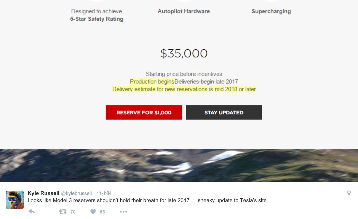 首先,对于这个改动,特斯拉官网并没有非常正式地对外公布,但昨天一位名叫Kyle Russell的创投公司a16z合伙人却率先发现了这个改变,并在Twitter上公开了自己的发现:“从官网的改动来看,Model3原定于2017底的交付计划又要歇菜了……”