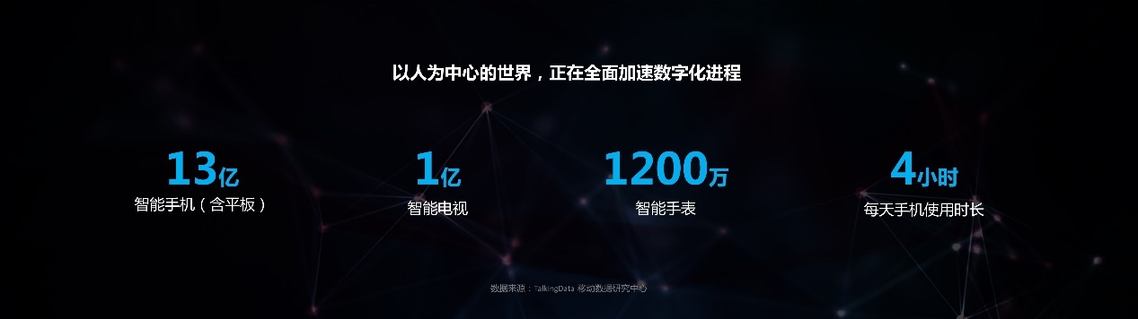 移动设备已经成为人类身体的延伸。根据TalkingData的数据统计,我们每天手机使用时长将近四个小时。好像历史上第一次有这么一件东西跟着人在一起,它甚至已经变成人体的一部分,它默默在后台记录着我们,不管上网,还是在现实生活中,在家中,在上班,在吃饭,在旅游,在消费,我们所有的足迹都在被默默地记录下来。好像我们这些数据行业迎来了历史上最好的时刻——数据爆发的时刻。