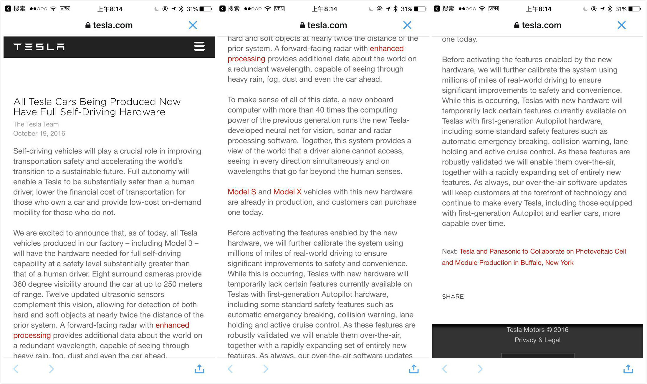 特斯拉表示,目前特斯拉工厂生产的所有车型(包括未来的Model 3)都已具备了进行完全自动驾驶的硬件基础,并且,特斯拉还特别说明,在此硬件基础上进行的自动驾驶其安全性有了空前提升,比人类司机要靠谱得多。