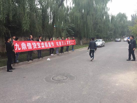 10月18日,借贷宝用户在北京贷宝公司门口挂出条幅(来源:网易财经)