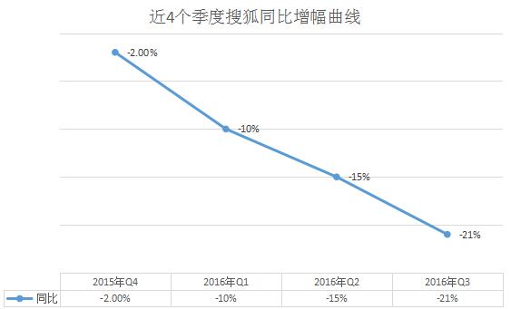 10月24日,搜狐公布了2016年第三季度未经审计的财务报告,总收入4.11亿美元。营收同比下滑21%,环比增长2%。净亏损为6500万美元,稀释后的每股净亏损为1.68美元。