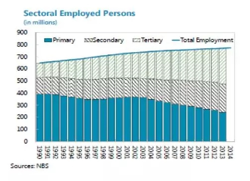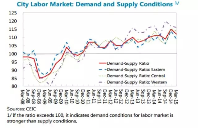 中国劳动力供给短缺也已经同期开始显现,从 2011年起,城市劳动力的用工需求对供给比例开始大于 100%。社会对通过加快人力资源的迅速流转和通过培训提升劳动力生产效能以最大程度利用有限劳动力资源的需求会越来越迫切。
