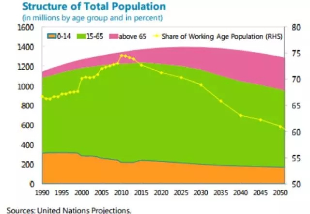 劳动力红利是支撑过去 30 多年中国经济高速增长的重要力量。但随着独生子女政策后遗症的显现,老龄化明显,这一红利正在消失。15 - 64 岁劳动年龄人口比重是评估劳动力结构的重要指标。该指标在 2011 年到达顶峰 74%之后,出现了 1990 年以来的首次下降,并在之后 4 年连续下滑,这一下跌趋势预计将加速继续,将在 2030 年降到 65%,即日本当前水平。