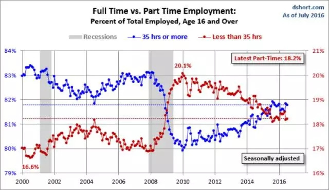 在人口结构变化之余,中国经济进入“新常态”实质上意味着中国经济开始告别长达十几年的繁荣,增长下滑成为常态,甚至可能出现衰退。企业缩减用工成本的需求迫切。从美国的经验来看,不同程度的经济下滑后的相当一段时间内都会促使企业为缩减开支而更倾向于使用兼职劳动力。