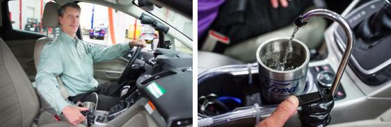 福特动力总成控制系统工程师Doug Martin在秘鲁首都利马看到一块广告牌,上面写着:将空气中的水分转换成当地居民的饮用水。这让已经拥有了70项汽车相关专利的他萌生出了一个创新的想法——汽车能否成为饮用水的来源呢?带着这个想法,他和同事一起,将这个想法变成了现实。他们一起发明了一个原型系统,当启动车内空调时,系统能收集、过滤、加压、冷凝、引流至车内的一个水龙头。每辆车一小时能够产生64盎司(约1.9升)的水,相当于四个矿泉水瓶的水量。在未来,这个系统将主要服务于那些用水困难的居民,例如在澳大利亚内陆地区。