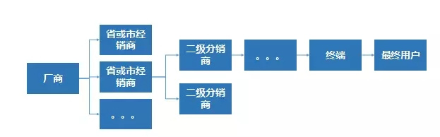 这张图是中国商品流通的一个典型结构。从一开始的厂商出来,到省或者是市经销商(现在大部分都是市经销商,很少有省的存在),再到下面二级分销商,三级再到终端,到最终用户。这个最终用户很多行业不太一样,快销品是最终的C,但有一些B2B领域还是B端用户。