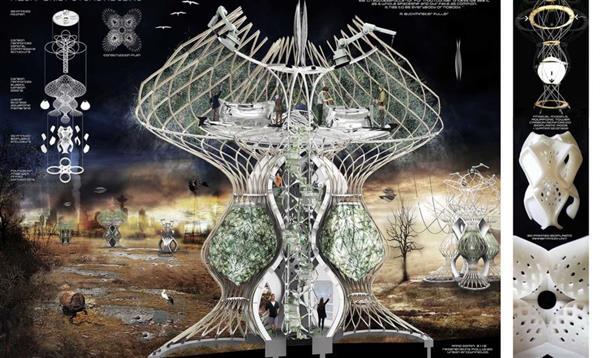 同时,这些植物为里面的居住者创造了一个健康、绿色的生活环境,这提供了一种逃离当今糟糕的城市空间的方式。据Chiriac解释,选择3D打印也是出于这样的逻辑。“建筑使用新颖的结构建造,这就要求使用轻量的活性弯曲的水培塔,里面有成长的农作物和鱼。”在这个塔中嵌入3D打印的居住单元,打印的材料源于室内的植物淀粉做成的生化塑料。未来这种灵活的房子将由Rep-Rap3D打印机打印成型,建材则是机器人制造的碳化加强的生化塑料棒和压制成的生化塑料板。