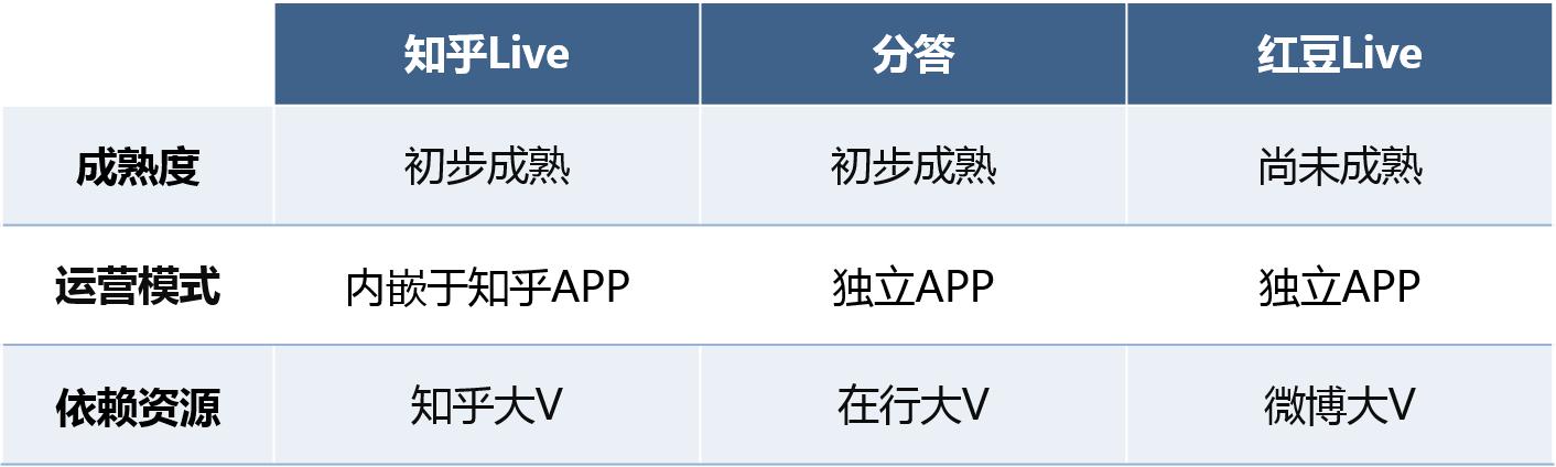 从产品运营的成熟度来看,随着一定时间的沉淀和用户使用习惯的培养,知乎Live和分答已初步走向成熟,但红豆Live仍属于产品上线初期,尚未成熟。