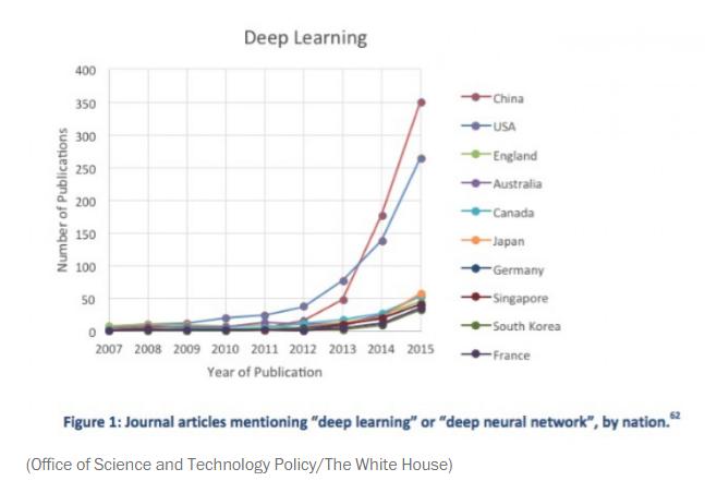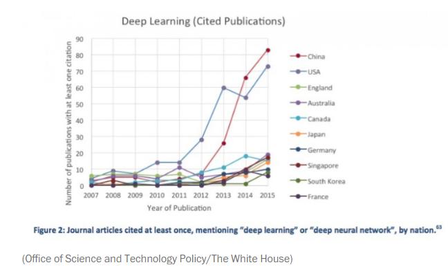 在代表未来的人工智能方面,中美两国也展开研发竞赛。以人工智能的一个分深度学习为例,中国的相关论文发表量已经超越美国,中美两国作为第一梯队遥遥领先于其他国家。