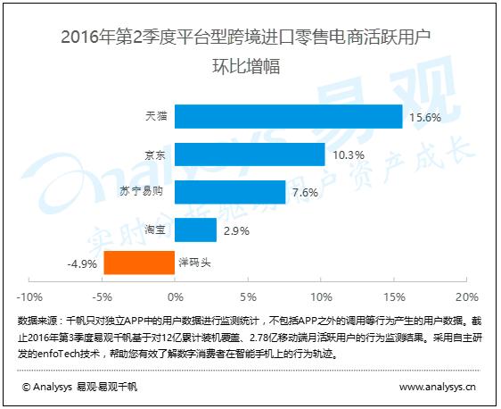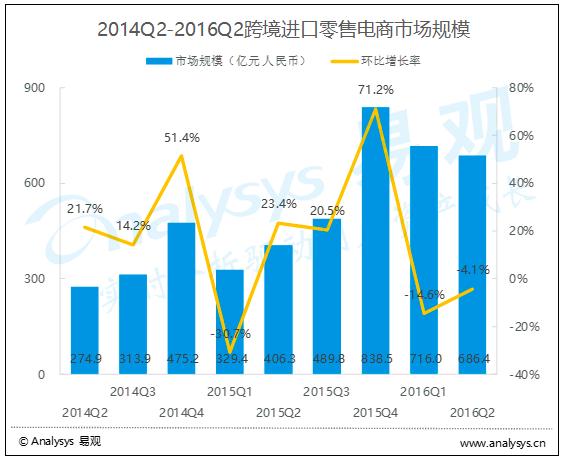 受这些规定与政策的影响,跨境电商受到了一定的冲击。据Analysys易观发布的《中国跨境进口零售电商市场季度监测报告2016年第二季度》数据显示,2016年第二季度,中国跨境进口零售电商市场规模为686.4亿元,环比降低4.1%。