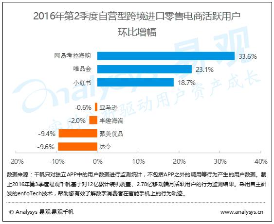 在自营型跨境进口零售电商中,网易考拉海购APP上活跃用户占比以33.6%的比例居于首位,其在邮箱、新闻、音乐、游戏等领域的用户协同效应逐渐被释放出来。而亚马逊APP的活跃用户表现为-0.6%。