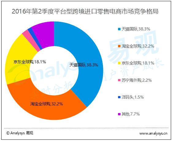 据易观的数据,在平台型跨境进口零售电商中,阿里旗下的天猫国际和淘宝全球购分别以38.3%和32.2%的市场份额分列第一二名。也就是说,阿里巴巴以70.5%的绝对优势占领者国内跨境电商市场。另外,京东全球购和苏宁海外购则以18.1%和2.2%的市场份额分列第三四名。