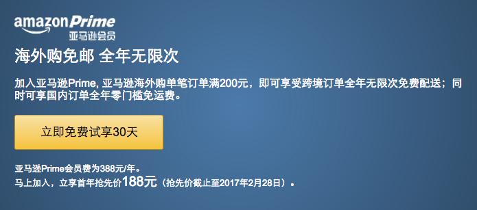 据悉,亚马逊Prime会员服务一年388元,消费者还可享受30天免费试用,而限时抢先价仅为188元,配送时间为5-9天。在美国目前Prime会员费为99美金,Prime会员可以享受任意金额包邮(非会员需够满35美金才包邮),亚马逊自营产品在美国境内2日送达。