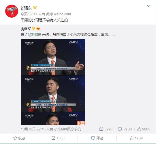 10月30日,雷军在微博上发布了刘强东在央视的采访,称终于找到小米招骂的原因。而今天,刘强东转发了此微博,并称平庸的公司是不会有人关注的。这样看来,两位企业大佬真可谓“惺惺相惜”。